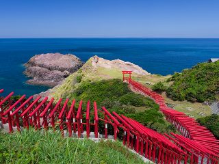 長門元乃隅神社(もとのすみじんじゃ)山口県長門市油谷にある「元乃隅(もとのすみ)神社」は、昭和30年に島根県にある「太鼓谷稲成神社」が派生し建てられた、本州最西北の稲荷神社です。地元の漁師・岡本斉の枕もとに真っ白なキツネが現れ「これまでに漁をしてこられたのは誰のおかげか」「われをこの地に鎮祭せよ」と告げられたことがきっかけで、建設されたと伝えられています。2015年にアメリカのテレビ局・CNNが発表した「日本で最も美しい場所31」のひとつに選出された、山口県長門市にある元乃隅稲荷神社。目の前に広がるコバルトブルーな日本海と、ずらりと並ぶ朱色の鳥居が生み出す神秘的な風景が、いま密かに話題をよんでいます。- 住所