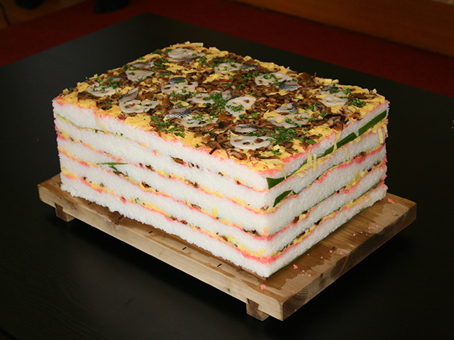 岩国市の郷土料理で、錦糸卵や穴子を重ねた豪華な押し寿司。「殿様寿司」とも呼ばれ、華やかな見た目と甘めの酢飯が特徴の人気名物です。