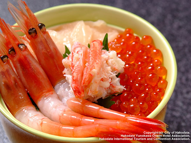 函館といえば、函館朝市、そして、海鮮丼。海鮮丼のネタは店によってさまざま。新鮮な海の幸をたくさん載せた、贅沢な丼ぶり。