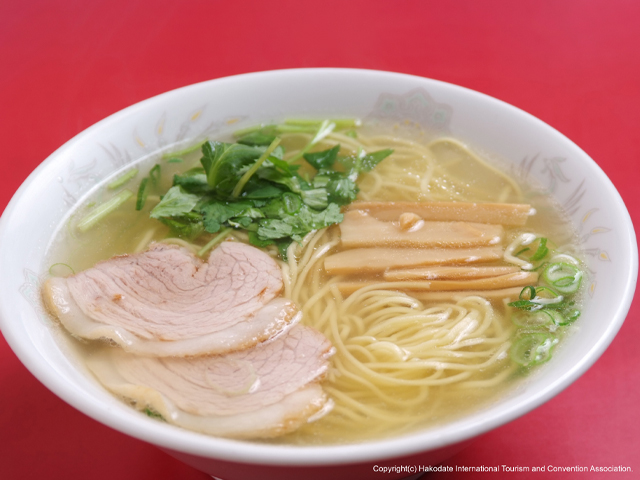 北海道三大ラーメンのひとつ。昔ながらのすっきりと透明な塩味スープ、ストレートタイプの細麺で具には麩を加えるのも、函館風。
