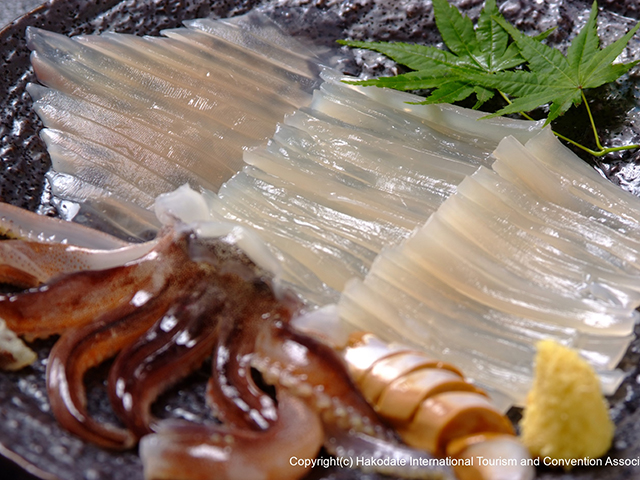 函館のイカは一般的にはスルメイカ。旬の時期は6~12月。獲れたてのイカを細めに切って醤油で食べる。コリコリとした食感を楽しむ。