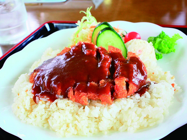 根室市で人気の名物料理「エスカロップ」。タケノコ入りのケチャップライスまたはバターライスにトンカツをのせ、デミグラスソースをかけたメニュー。
