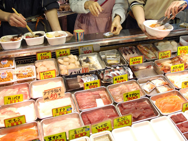 釧路名物オリジナル海鮮丼「勝手丼」は和商市場が発祥。ご飯を片手に店を渡り、自分の好きな具だけを載せて完成。具材の種類はお店によって異なる。