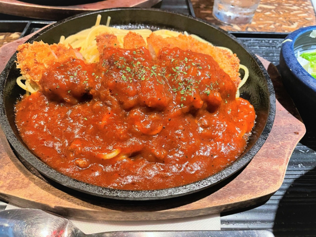 洋食店「泉屋」を起源とする「スパカツ」はアツアツに熱した鉄板皿の上に、濃厚なミートソースのスパゲッティと肉厚なトンカツを乗せた料理。