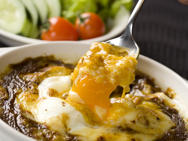 門司港グルメ「焼きカレー」 。発祥は門司港にあった喫茶店が余ったカレーをグラタン風に焼いて食べたまかない料理。チーズや玉子などトッピング。