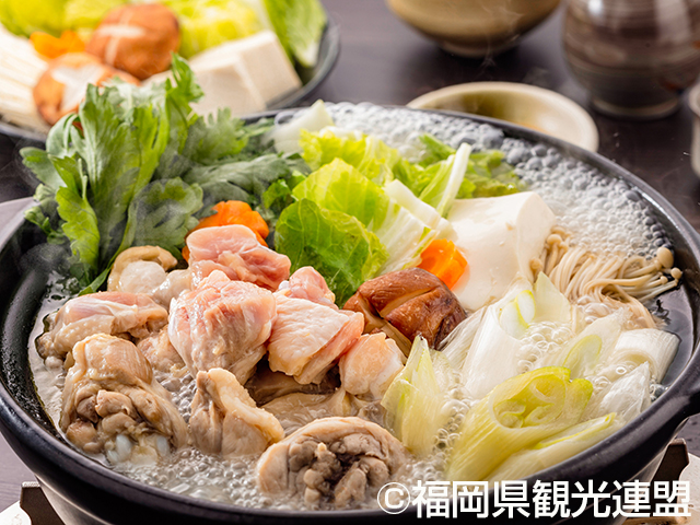 福岡の郷土料理「水炊き」。鶏のぶつ切りを水から煮立たせる店が多く、スープは骨や肉から出る旨みがたっぷり。ポン酢を付けて食べる。