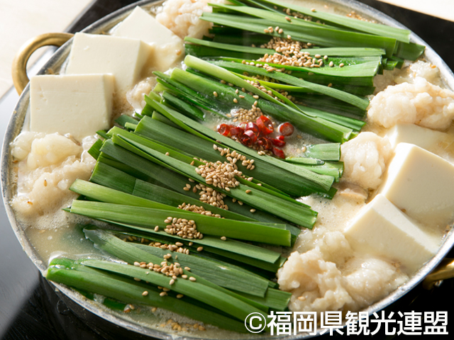大人気のご当地グルメ「もつ鍋」。牛のモツ(ホルモン)・キャベツ・ニラを材料とした鍋料理。味は醤油・味噌・水炊き風の3タイプ。
