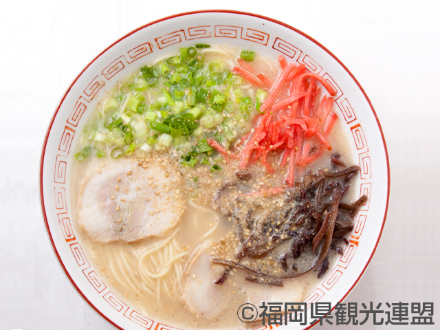 日本三大ご当地ラーメンのひとつ。「博多ラーメン」は濃厚な白濁色の豚骨スープとストレートの細麺が特徴。紅しょうがや辛子高菜をトッピング。