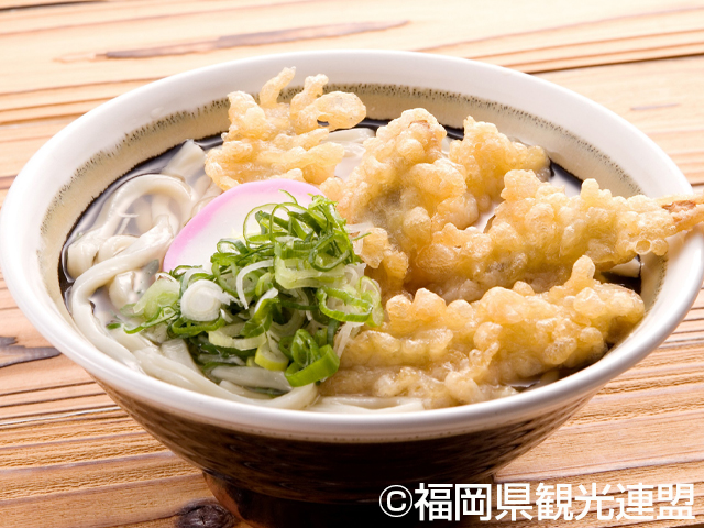 「博多うどん」は、コシがなくてふんわりと柔らかい麺に透明なあごだしの汁。ごぼう天や魚の練り物の丸天をいれるのが定番。