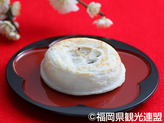 太宰府の門前町に欠かせない名物「梅ヶ枝餅」。小豆餡を薄い餅の生地でくるみ、梅の刻印が入った鉄板で焼いた素朴な味わいの餡子餅。