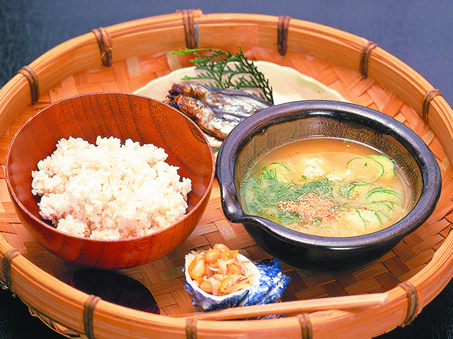 郷土料理「冷や汁」。焼き味噌をのばした汁にほぐした焼アジなどや豆腐、きゅうり、青じそなどの薬味を入れてアツアツのご飯をかけた栄養満点な一杯。