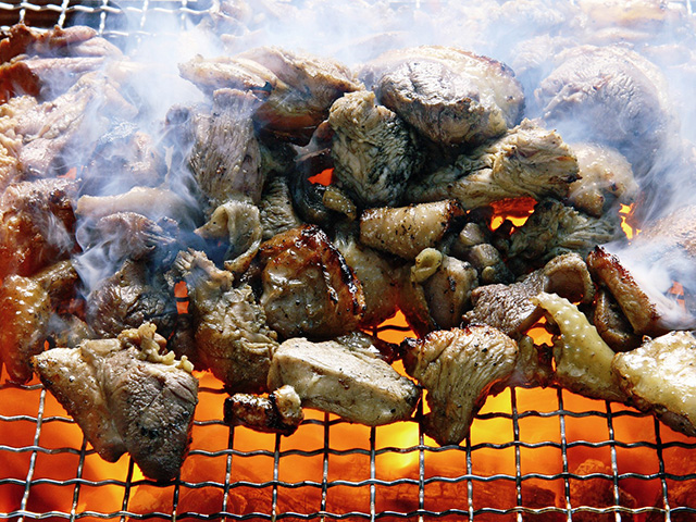 火柱の中で豪快に炙り焼く「地鶏の炭火焼き」。炭の香ばしさをまとった鶏肉は弾力があり、噛めば噛むほど肉汁が口いっぱいに広がる。