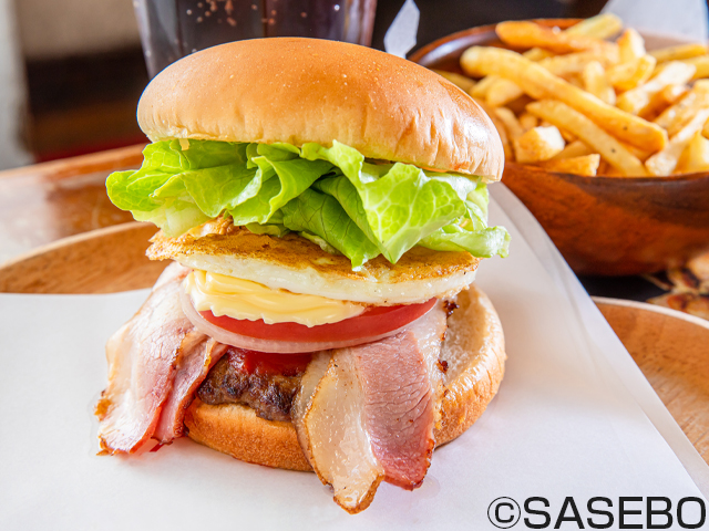 ご当地ハンバーガー「佐世保バーガー」。オーダーを受けてから作り始め、フレッシュな生野菜を使用、オリジナルソースが入っている事が必須条件!