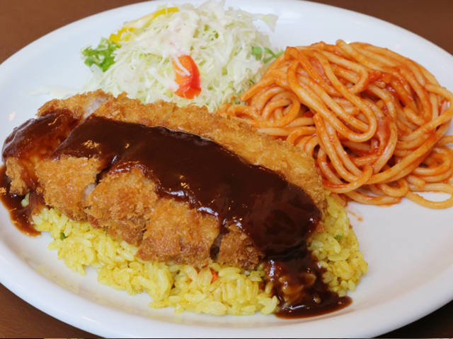 長崎で親しまれている「トルコライス」。ピラフ、スパゲッティ、ポークカツ、そしてたっぷりのデミグラスソースがのったワンプレート。