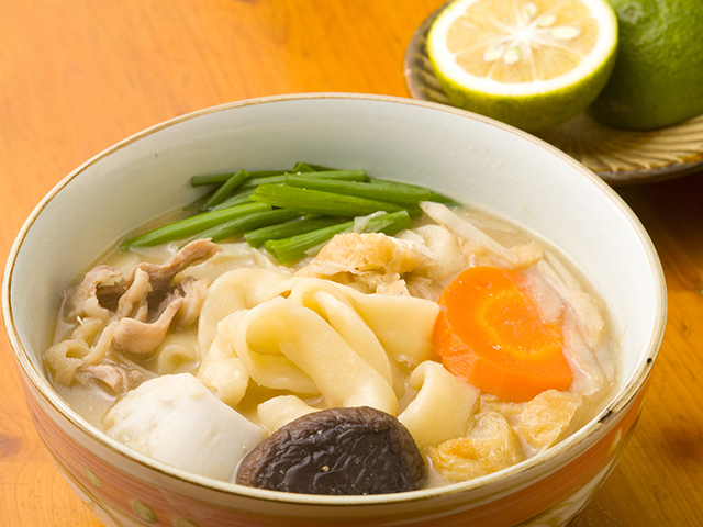 大分では代表的な郷土料理の1つの「だんご汁」。だんごは、塩を入れた小麦粉を練り上げ、手で薄く延ばしたもので、汁は野菜をたっぷり入れた味噌味。