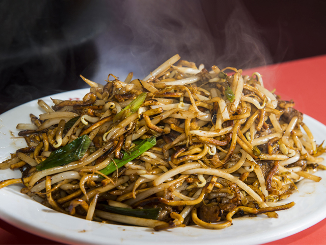 日田市民が愛するソウルフード「日田やきそば」。具はシンプルにもやしとねぎと豚肉、茹でた麺を鉄板でしっかりとカリカリになるまで焼くのが特徴。