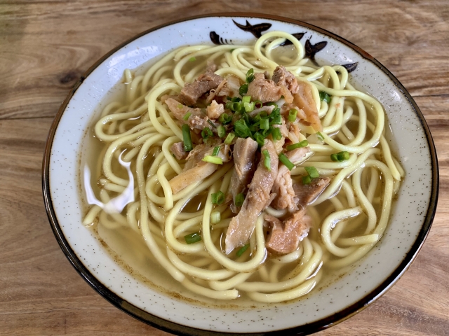 八重山列島の沖縄そば。スープは豚骨のだしで、ほんのり甘みのある優しい味わい。 醤油で煮た豚の赤身肉とカマボコを細切りにして載せるのが特徴。